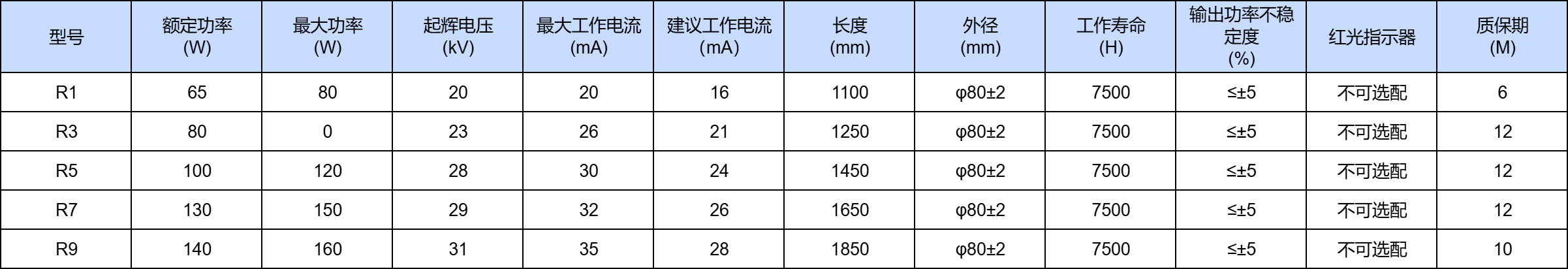 永利 R 系列二氧化碳激光管是品牌旗下最为成熟、稳健的第三代激光技术代表作。该系列功率跨度从 65W (R1) 到 160W (R9),不仅承载了永利数十年的制造工艺精髓,更因其卓越的生产稳定性和深厚的市场口碑,成为了全球初创企业和预算敏感型加工业务的“基石之选”。