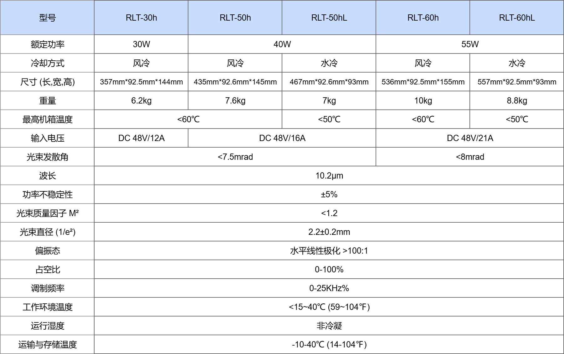 永利 (Yongli) RLT-h 系列:10.2 μm 波长(30W/50W/60W) 射频 (RF) CO2 激光器